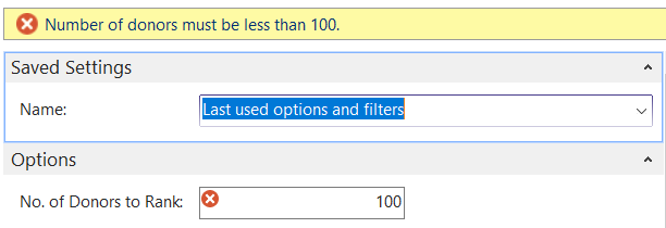3. On the Options Tab, enter the number of donors you would like to rank in the No. of Donors to Rank field. The report is limited to 99 donors. If you attempt to enter a number greater than 99 the below message will appear. Additionally, if the report is run with a zero (0) value in this field, it will default the number of donors to rank at 20.